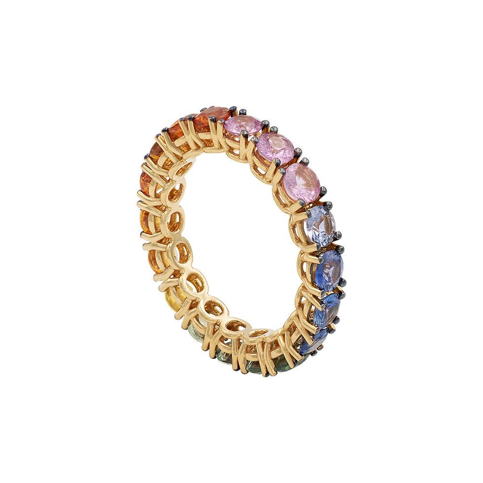 Un intramontabile classico come il tennis, rivisitato in scala colore arcobaleno in prezioso oro 18 carati e zaffiri multicolore.